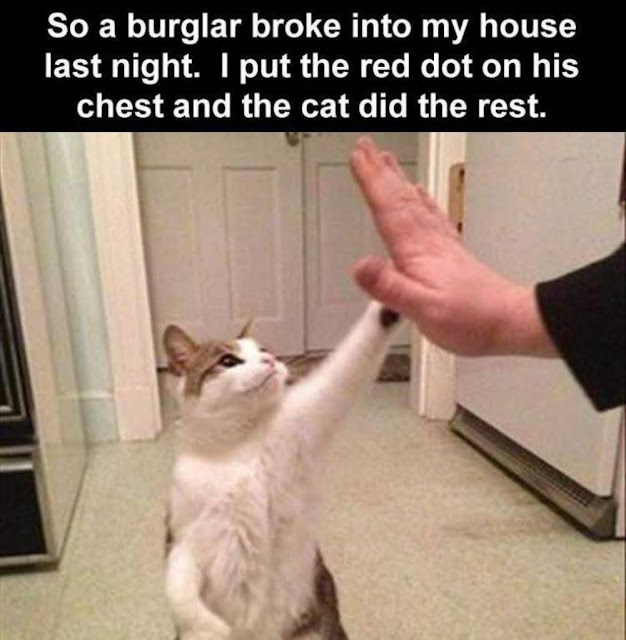 Who says it has to be dogs that are man's best friend? With the proper motivation, a cat can do much of the same things a dog does. Including attacking uninvited guests. While you might need to issue commands to the dog, obviously the cat just needs you to paint the target with a laser.